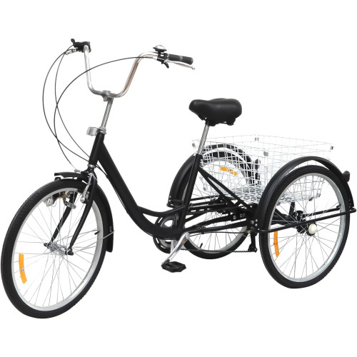Механичен велосипед триколка - 24 цола, 6 скорости, 3 спирачки, Товарен кош, Фар с динамо, Цвят Черен Матов